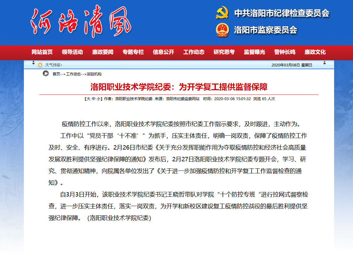 2020年3月6日,洛阳市纪委监委河洛清风网,刊登《洛阳职业技术学院纪委:为开学复工提供监督保障》。原文如下: