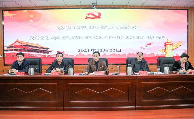 12月22日下午,洛阳职业技术学院党委组织2021年度38名新提拔干部进行集中廉政谈话,谈话会议由党委副书记任晓平主持。党委书记朱美荣,纪委书记、监察专员邓卫国出席会议并讲话。