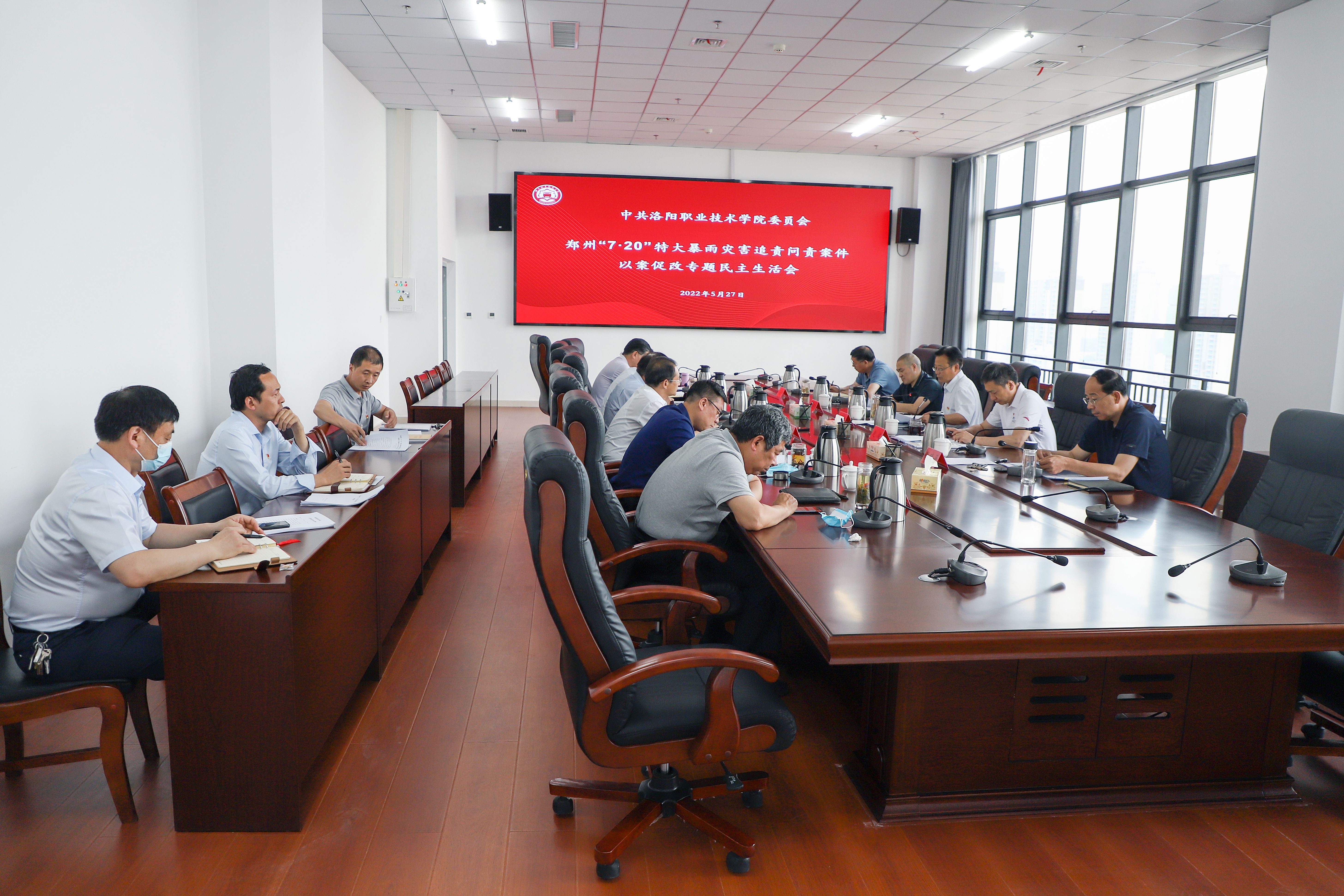 按照中共洛阳市纪委机关、市委组织部关于转发《中共河南省纪委机关中共河南省委组织部关于深刻汲取“7•20”特大暴雨灾害追责问责案件教训开展以案促改专题民主生活会的通知》(洛纪发〔2022〕5号)要求,5月27日,洛阳职业技术学院党委班子召开郑州“7·20”特大暴雨灾害追责问责案件以案促改专题民主生活会,深入贯彻习近平总书记关于防灾减灾救灾工作的重要指示,树牢师生至上、生命至上理念,深刻汲取郑州“7·20”特大暴雨灾害教训,联系思想和工作实际,进行对照检查,开展批评和自我批评,着力提高化解重大安全风险和应急处突能力。