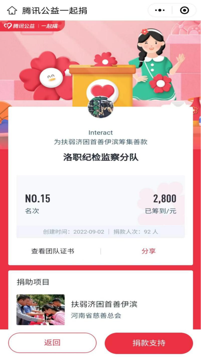 活动期间,纪检监察机关党支部全体党员通过答题、送TA小红花、捐献运动步数、转发好友助力等互动方式参与募捐活动,充分利用平台配捐规则获得额外配捐、放大爱心,为本次活动募捐善款2800元(截止9月9日12时)。